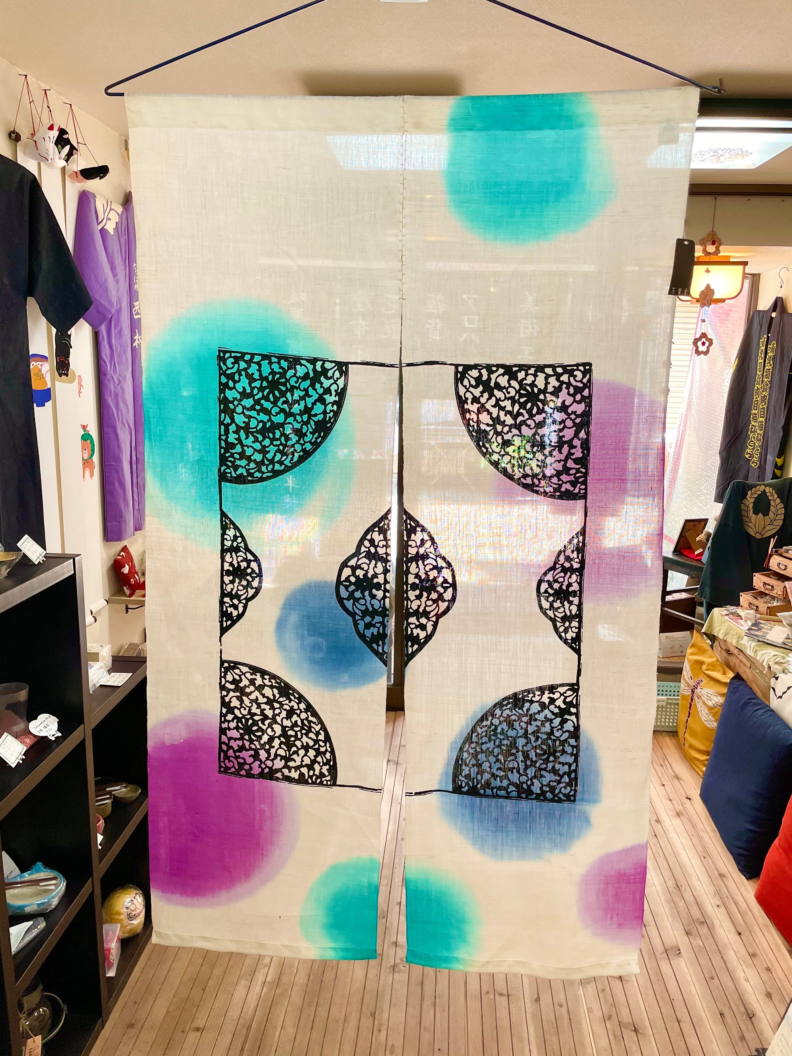 美しい色の染めが入ったアートな暖簾でございます。見る人によっては、窓や扉のようにも見えるかも知れません。