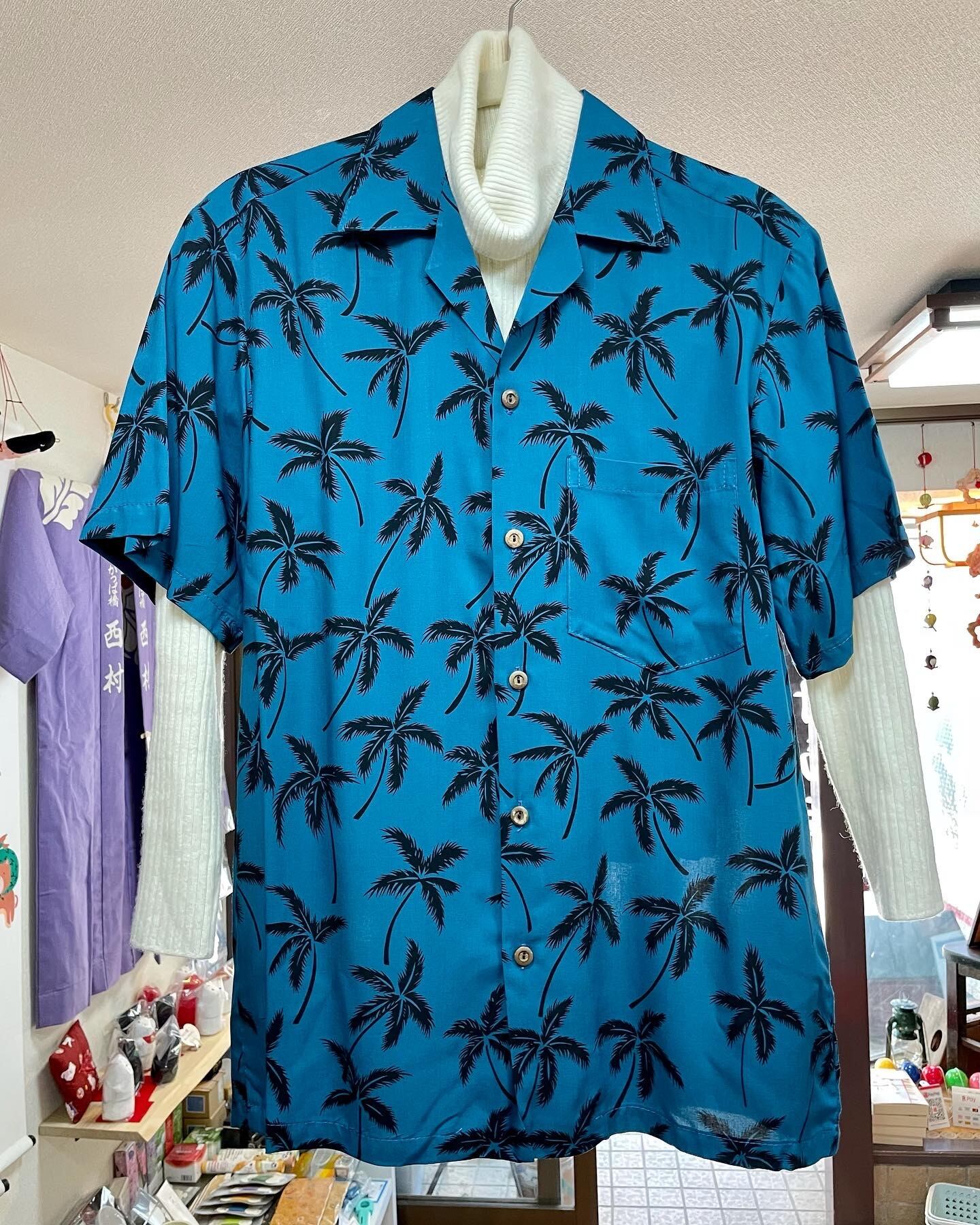 ハワイより直輸入しました、Two Palms社のアロハシャツでございます。人気のヤシの木柄。活躍のシーンが沢山ありそうな、シックで洒落た仕上がりです。